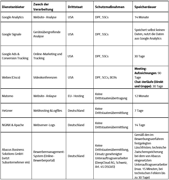 Zur Entgegennahme und Bearbeitung von Bewerbungen und Initiativbewerbungen nutzen wir ein Online-Bewerbungsportal, das technisch über ein externes Bewerbungsmanagementsystem der Abacus Business Solutions GmbH, Deutschland, betrieben wird. Die Abacus Business Solutions GmbH ist hierbei als Auftragsverarbeiter gemäß Art. 28 DSGVO tätig und verarbeitet Bewerbungsdaten ausschließlich auf unsere Weisung und zum Zweck der Durchführung des Bewerbungsverfahrens.
